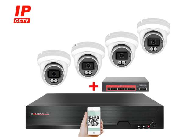 IP kamerový set s externím PoE pro jednoduché sestavení svépomocí. NVR v sobě nemá instalováno napájení kamer, které je řešeno pomocí switch. Lze tedy umístit switch (napájení IP kamer) na jiné místo než rekordér, který se následně připojuje k obrazovce/internetu.