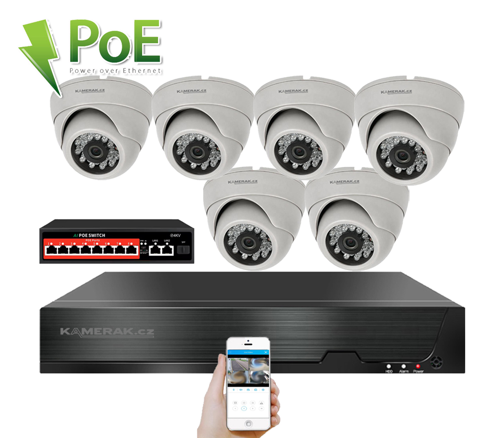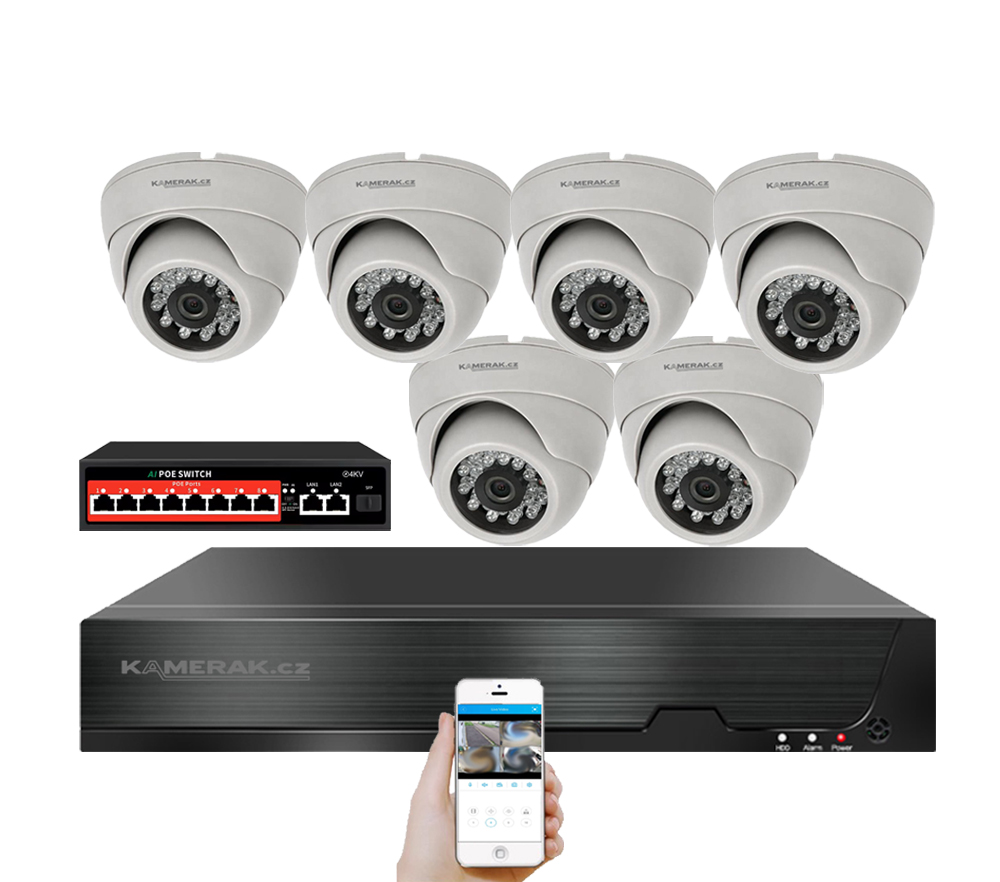 IP kamerový set s externím PoE pro jednoduché sestavení svépomocí. NVR v sobě nemá instalováno napájení kamer, které je řešeno pomocí switch. Lze tedy umístit switch (napájení IP kamer) na jiné místo než rekordér, který se následně připojuje k obrazovce/internetu.