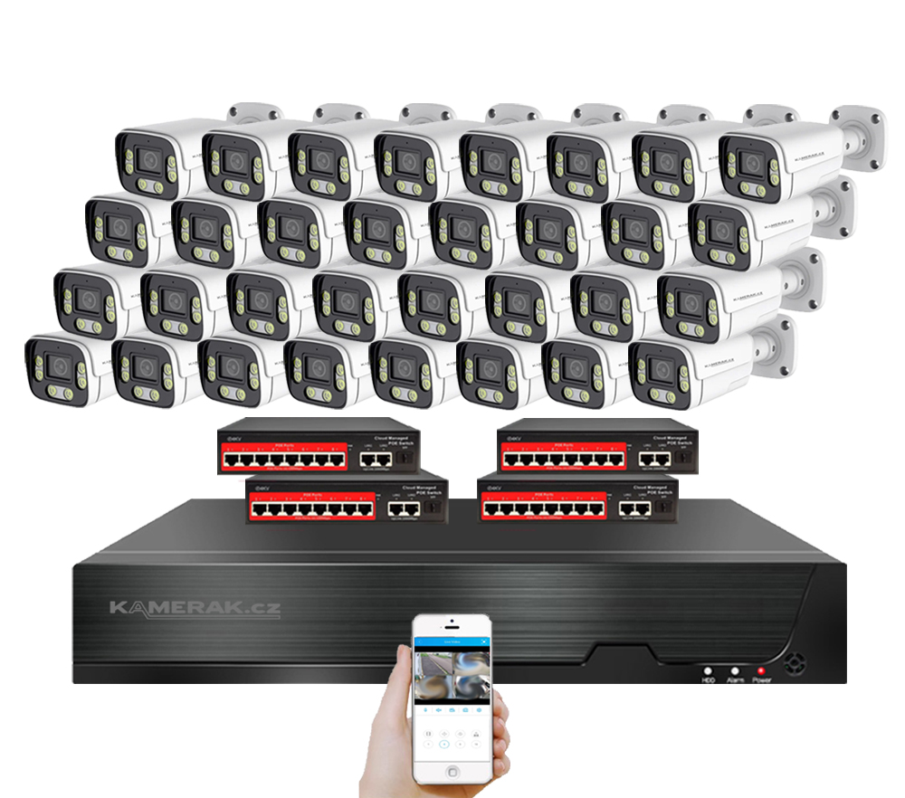 IP kamerový set s externím PoE pro jednoduché sestavení svépomocí. NVR v sobě nemá instalováno napájení kamer, které je řešeno pomocí switch. Lze tedy umístit switch (napájení IP kamer) na jiné místo než rekordér, který se následně připojuje k obrazovce/internetu.