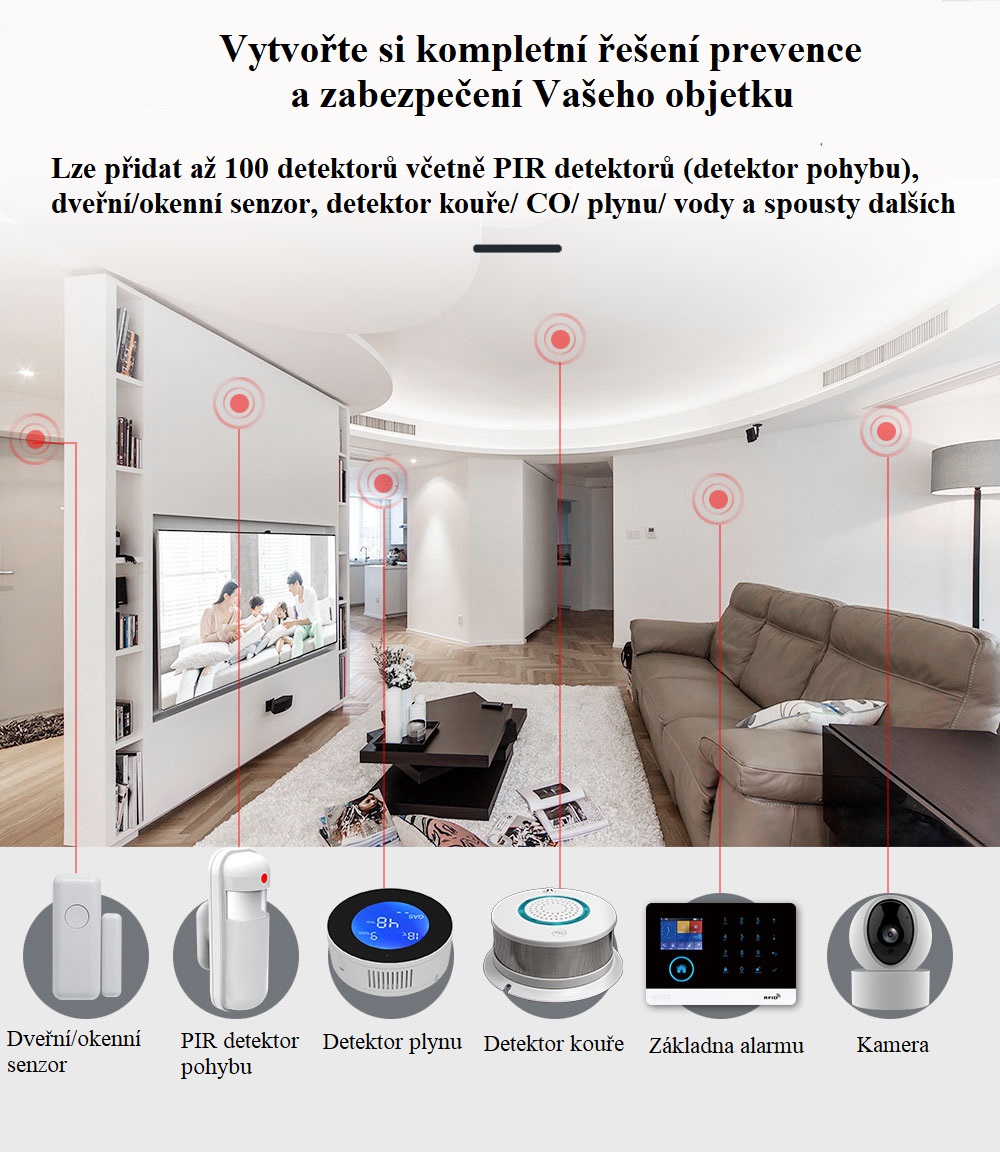 - Podporuje mnoho druhů čidel a detektorů: Pohybové, okenní/dveřní, plynu, úniku vody apod.