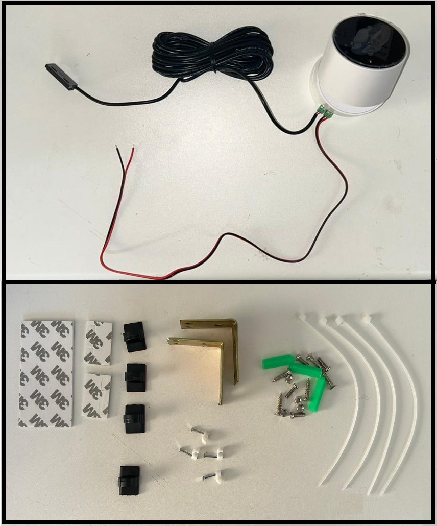 1x Montážní materiál pro uchycení kabelu čidla, 3M páska, šrouby, montpásky, držáky pro polohování čidla.