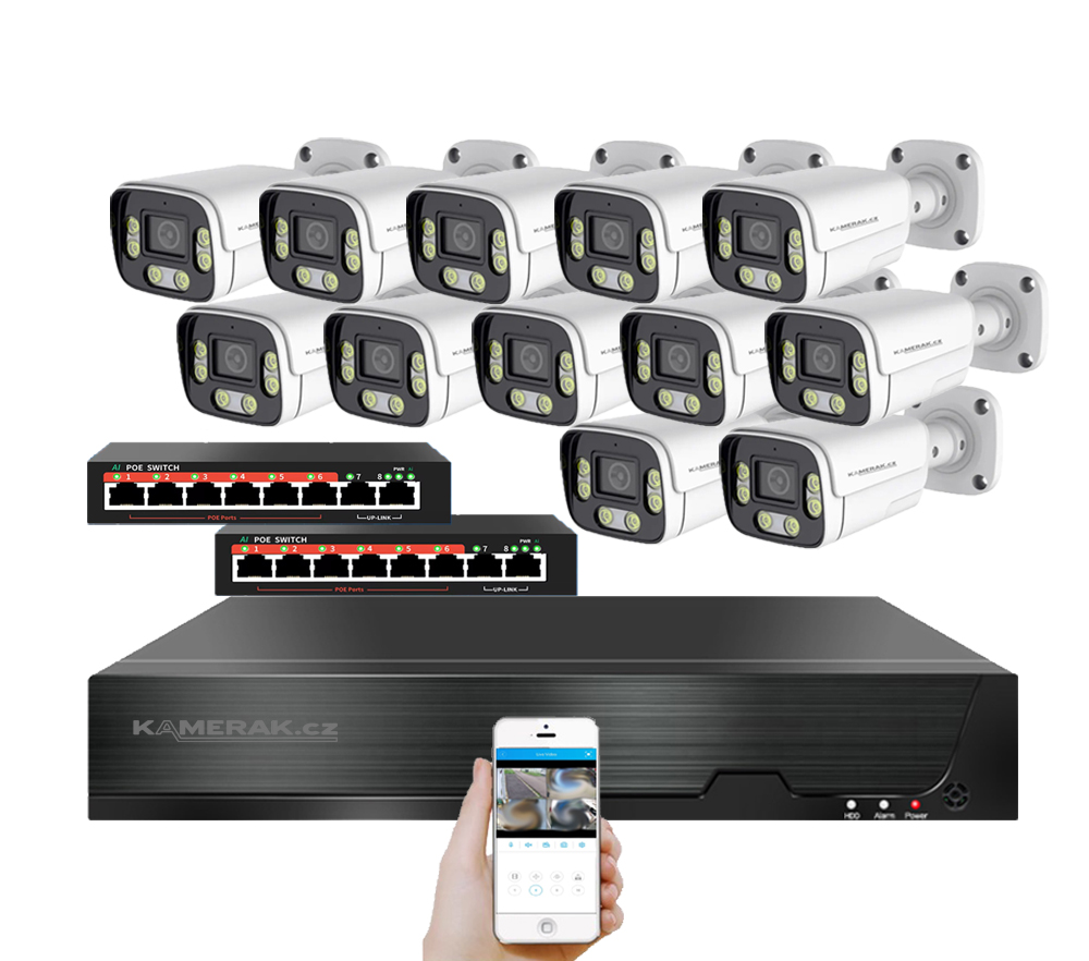 IP kamerový set s externím PoE pro jednoduché sestavení svépomocí. NVR v sobě nemá instalováno napájení kamer, které je řešeno pomocí switch. Lze tedy umístit switch (napájení IP kamer) na jiné místo než rekordér, který se následně připojuje k obrazovce/internetu.