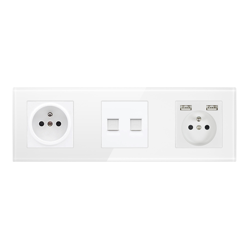 SRAN Trojnásobný skleněný rámeček včetně modulů 230V+230V s 2*USB 5V a zásuvky 2xRJ45 v rámečku 258mm, sklo bílý - Cena: 328 Kč