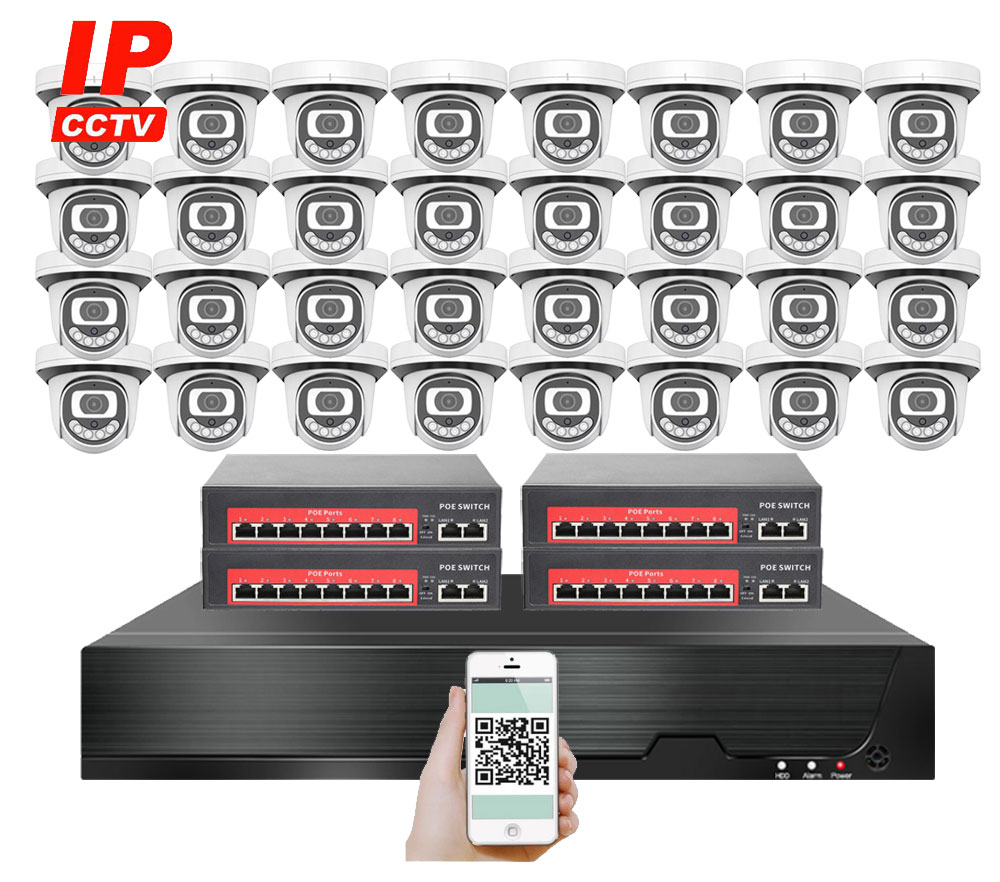 IP kamerový set s externím PoE pro jednoduché sestavení svépomocí. NVR v sobě nemá instalováno napájení kamer, které je řešeno pomocí switch. Lze tedy umístit switch (napájení IP kamer) na jiné místo než rekordér, který se následně připojuje k obrazovce/internetu.