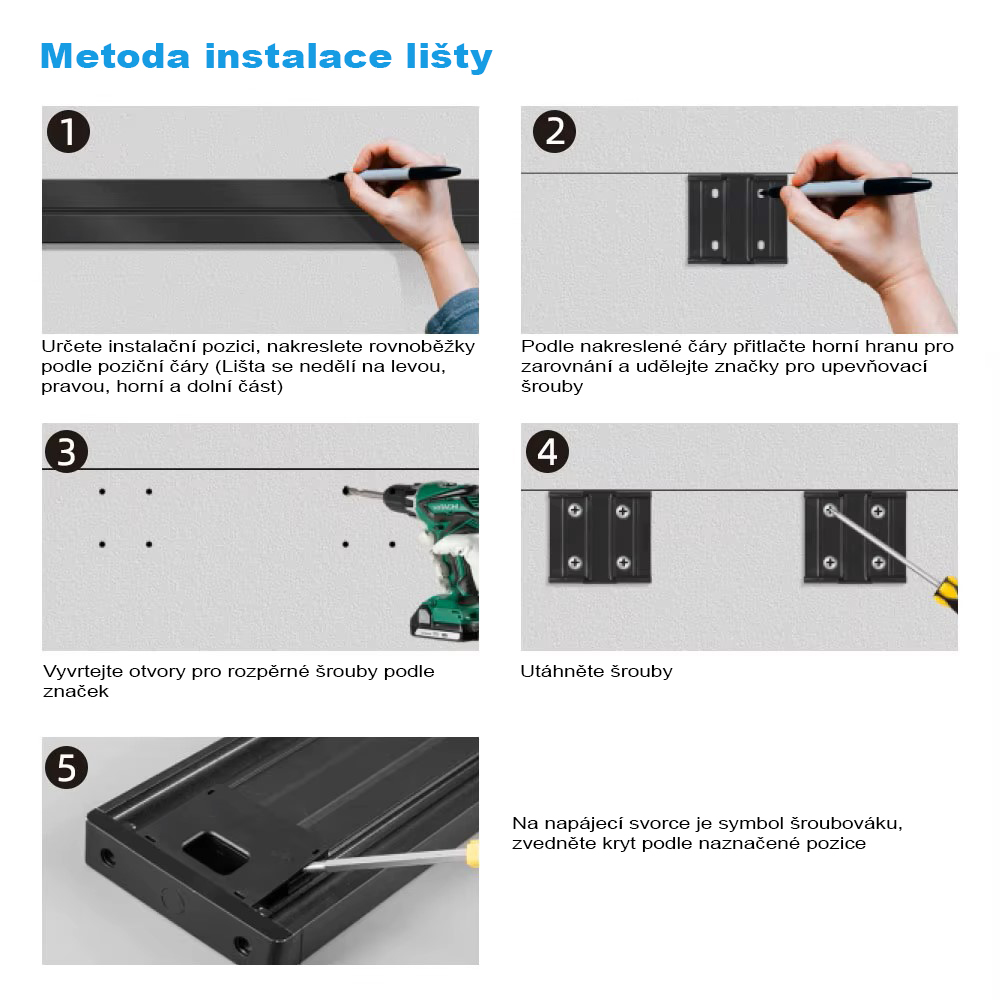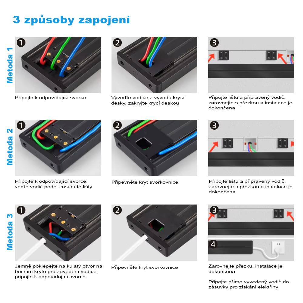 Poznámka: Zásuvkové moduly (jednotlivé zásuvky) pro tuto lištu se prodávají samostatně a nejsou součástí balení. Na obrázku jsou pro ilustraci zobrazeny různé typy zásuvkových modulů VoltLine.