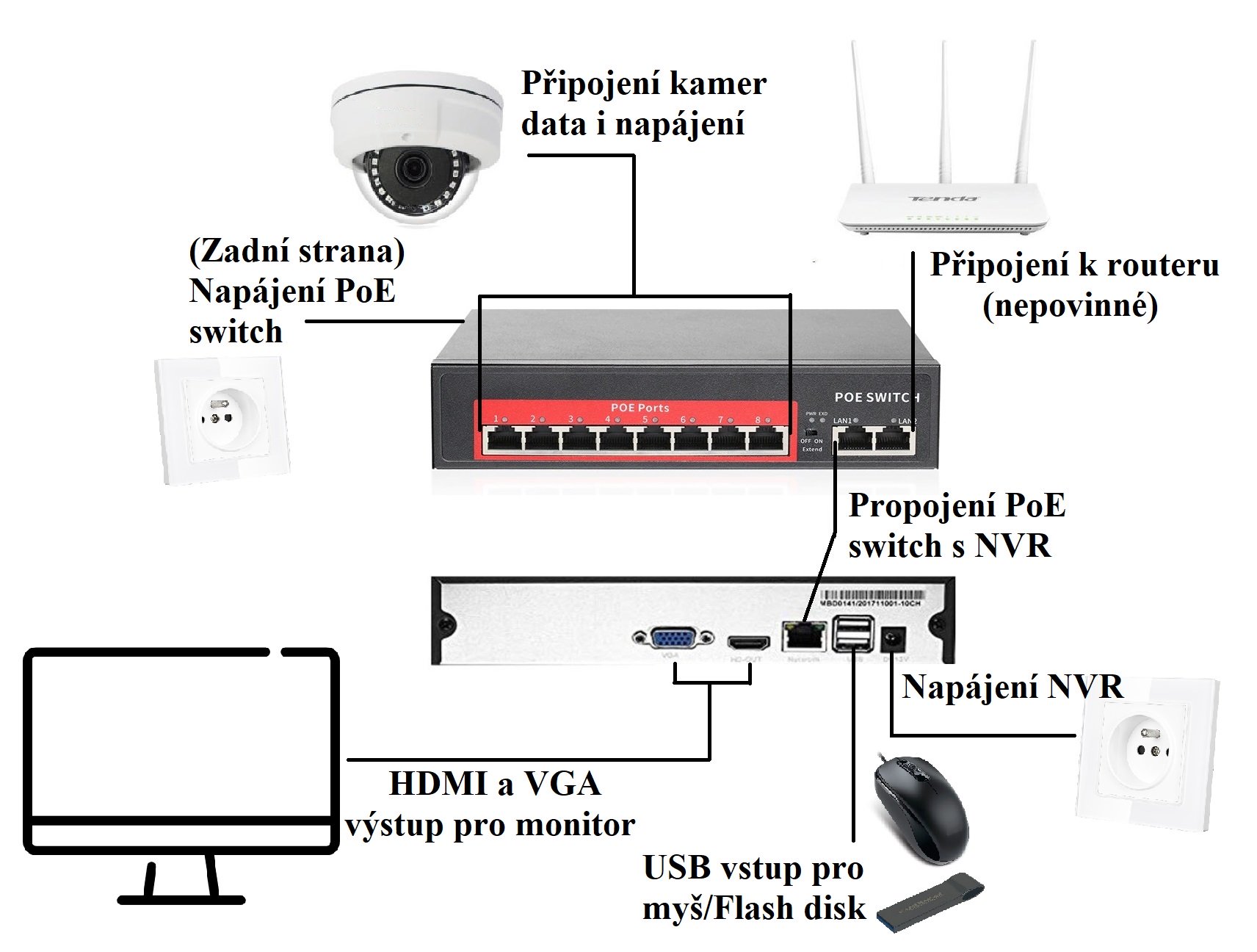 IP kamerový set s externím PoE pro jednoduché sestavení svépomocí. NVR v sobě nemá instalováno napájení kamer, které je řešeno pomocí switch. Lze tedy umístit switch (napájení IP kamer) na jiné místo než rekordér, který se následně připojuje k obrazovce/internetu.