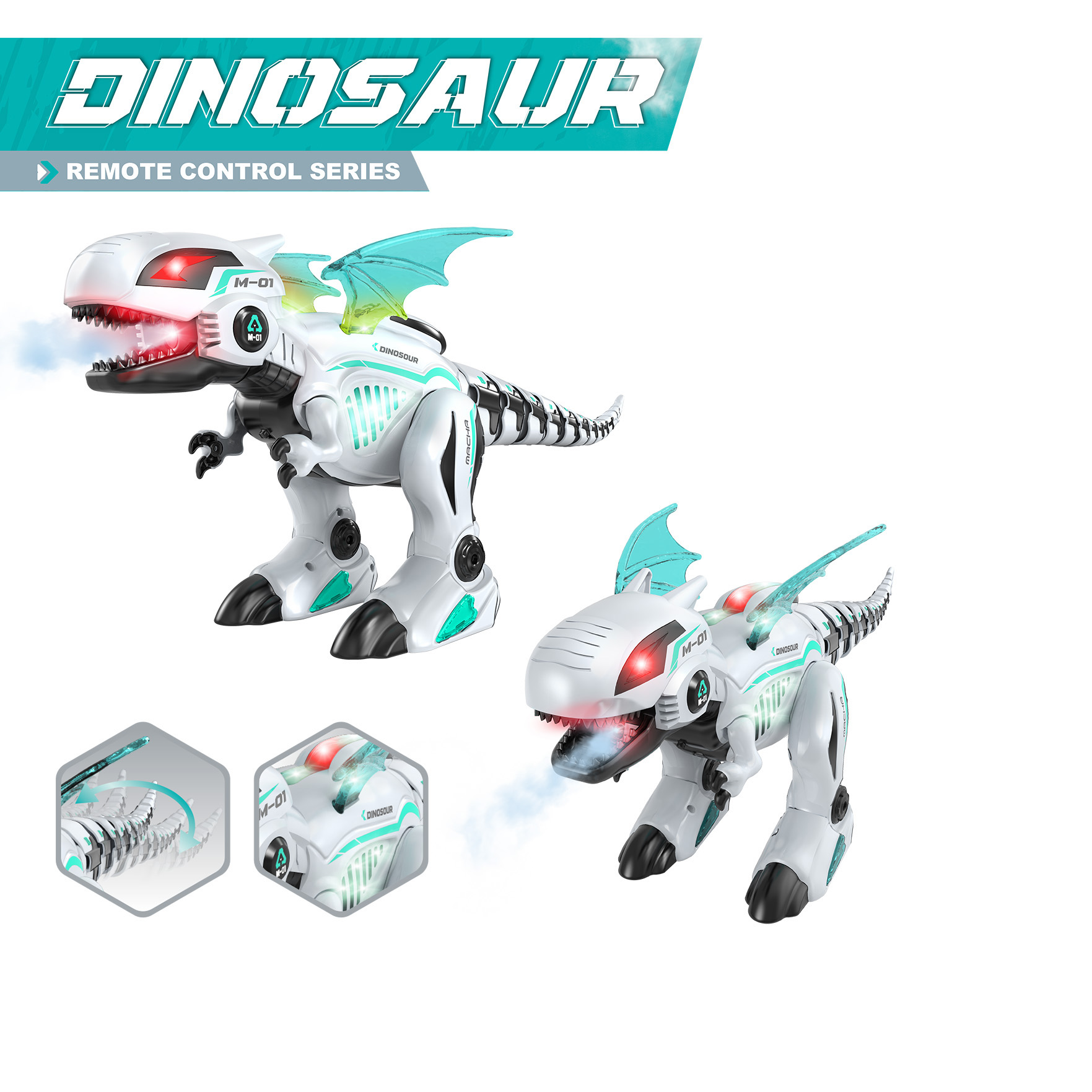 5. Unikátní Design: Kombinace bílé a tyrkysové s mechanickými detaily (viditelná páteř, trysky na zádech) a mechanickým ocasem/křídly (stylizovaný drak/T-Rex) okouzlí každého kluka i holku.