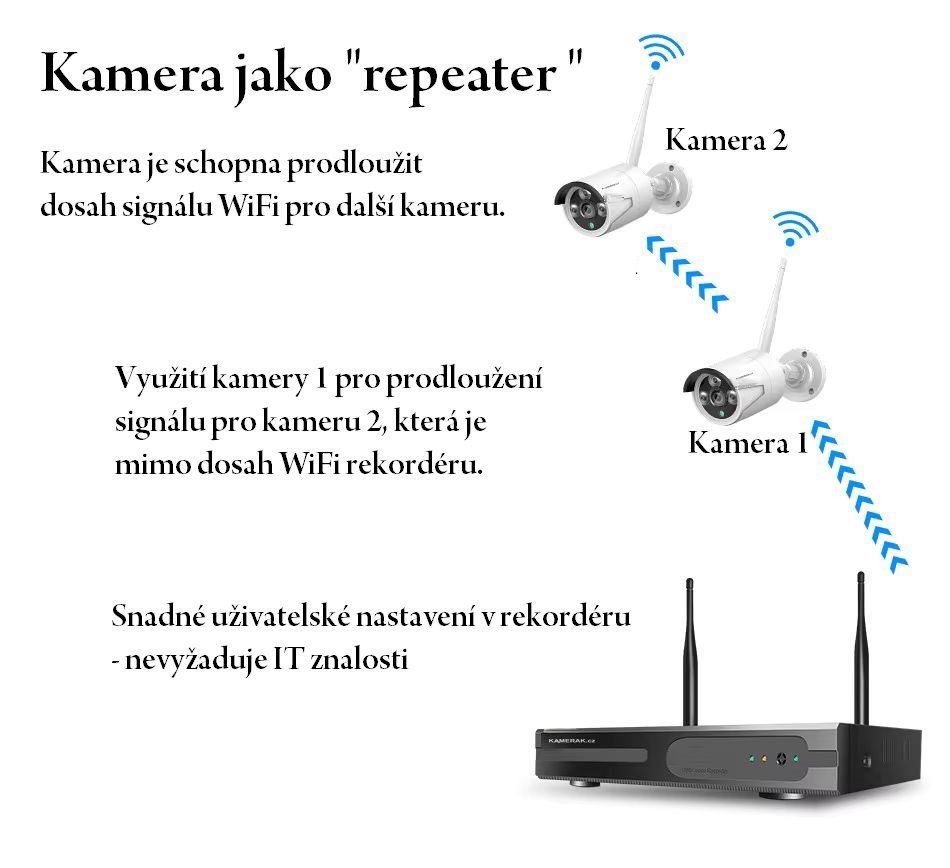 Otočná WiFi kamera zaručuje vizuální přehled o dění ve snímaném prostoru. Kamera disponuje funkcí repeateru (opakovače), kdy je schopna prodloužit signál pro další kameru, která je umístěna mimo dosah WiFi rekordéru.
